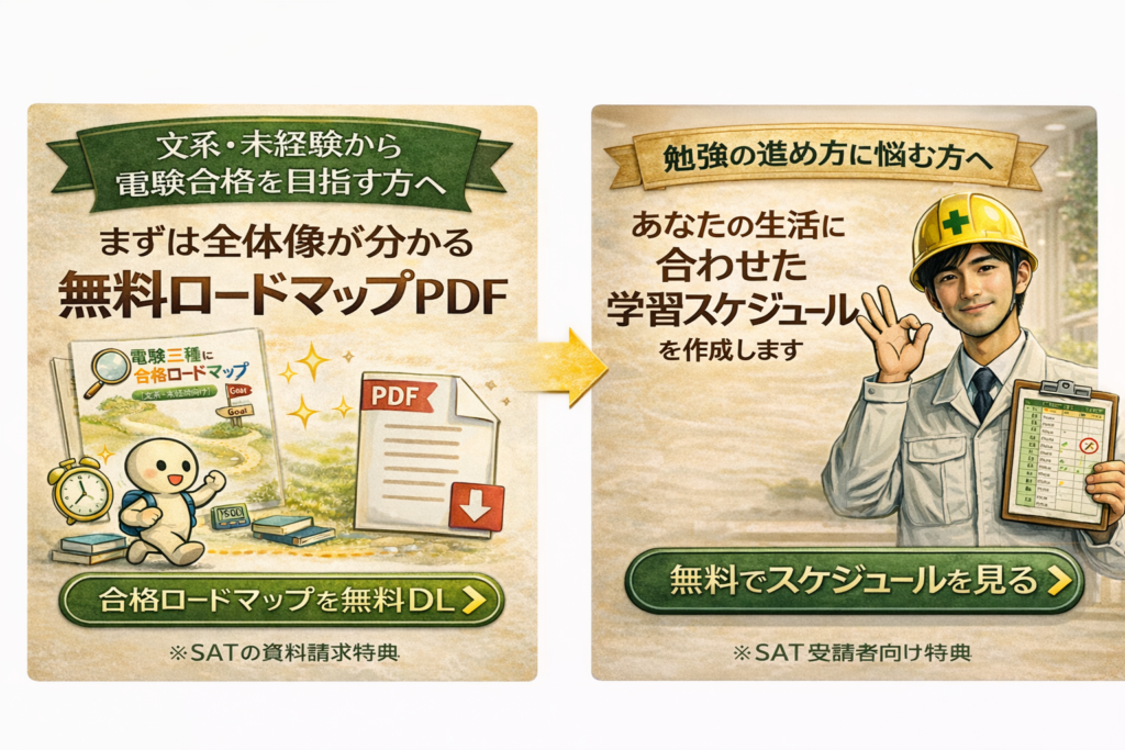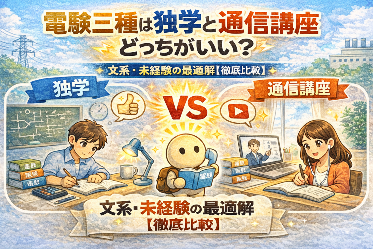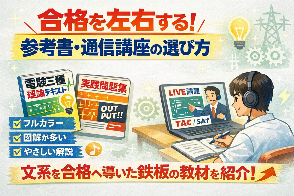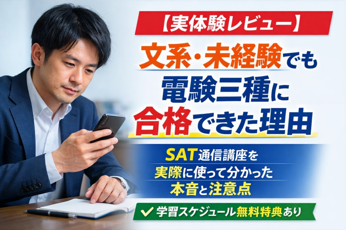 電験三種で人生は変わる?文系高卒から年収100万円UPしたリアル 2026.02.25 転職 echigoya@denken_guide ゼロから電験|合格と転職のロードマップ 電験三種は独学と通信講座どっちがいい?文系・未経験の最適解【徹底比較】 2026.02.13 はじめかた echigoya@denken_guide ゼロから電験|合格と転職のロードマップ お問い合わせ 2026.02.07 未分類 echigoya@denken_guide ゼロから電験|合格と転職のロードマップ 文系・未経験が電験三種に合格する勉強法|実体験から分かった最短ルート 2026.02.05 未分類 echigoya@denken_guide ゼロから電験|合格と転職のロードマップ 【徹底レビュー】SAT電験三種を文系が使って合格|口コミは本当か?費用対効果を正直検証 2026.02.02 未分類 echigoya@denken_guide ゼロから電験|合格と転職のロードマップ 電験三種合格後、実際に起きたキャリアの変化【実体験】 2026.01.28 未分類 echigoya@denken_guide ゼロから電験|合格と転職のロードマップ SATの資料請求・講座申込み特典について 2026.01.26 教材 echigoya@denken_guide ゼロから電験|合格と転職のロードマップ 合格を左右する 電験3種 文系・初心者の【参考書・通信講座の選び方】 2026.01.20 教材 echigoya@denken_guide ゼロから電験|合格と転職のロードマップ 電験三種 合格ロードマップ【文系・未経験向け】 2026.01.16 はじめかた echigoya@denken_guide ゼロから電験|合格と転職のロードマップ 文系・未経験でも電験三種に合格できる?結論と実体験 2026.01.13 はじめかた echigoya@denken_guide ゼロから電験|合格と転職のロードマップ もっと見る