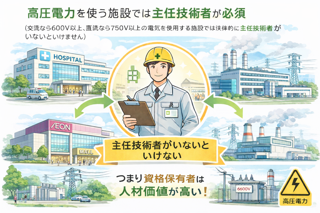 高圧電力(交流なら600V以上、直流なら750V以上)の電気を使用する施設では法律的に主任技術者がいないといけません。つまりイオンなどの商業施設やほとんどの工場では必須の存在です。